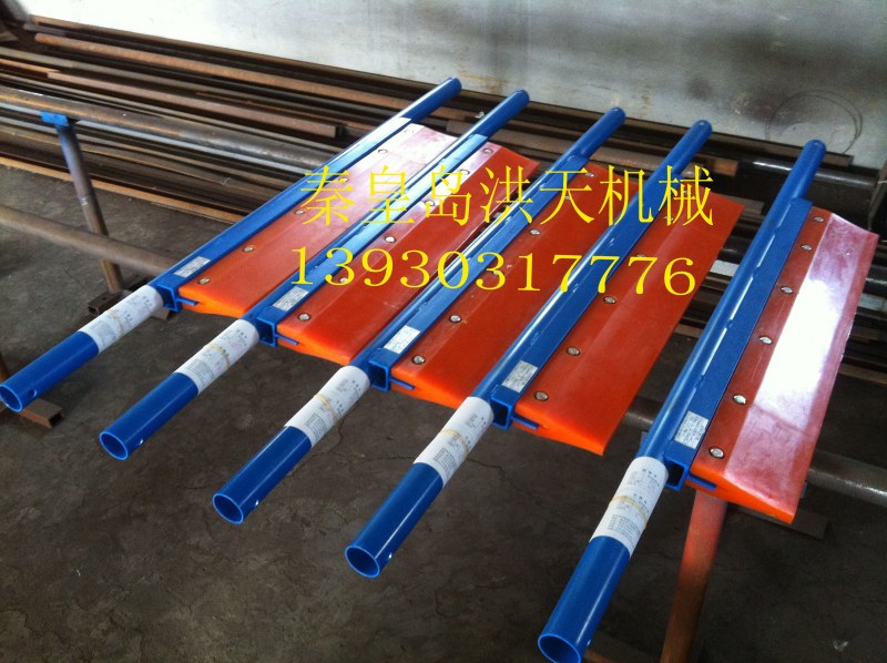 二道清掃器安裝在頭輪下部回移皮帶平直工作面處。P型清掃高分子聚氨酯器適用于清掃回移帶工作面上粘附的物料,屬于二道清掃器。